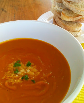 So here we have a soup with no water, no onion or garlic, no salt or pepper. We start with diced pumpkin, cooked gently in olive oil until soft. Then fresh carrot juice and one Stock Pot gel (I used chicken) are added, and the mixture simmered for 8 minutes. I wouldn't have thought to put carrot juice into pumpkin soup, but the flavours are really quite complementary and the carrots add a stunning intense colour. I made a half batch of Marco's recipe, which was all I could have made really, considering it took me a whole 1.5kg bag of carrots to get 650ml carrot juice. Marco specified 'big carrots' because, he said, their flavour was better. He also specified big pumpkins; I used one of the large grey Crown pumpkins which seemed to work well. The only flavourings apart from the Stock Pot in the soup are a little bit of Parmesan and a little cream. The whole thing took about half an hour to make, including chopping and juicing (although not counting cleaning the juicer, a job which always reminds me why I don't use the juicer very often).